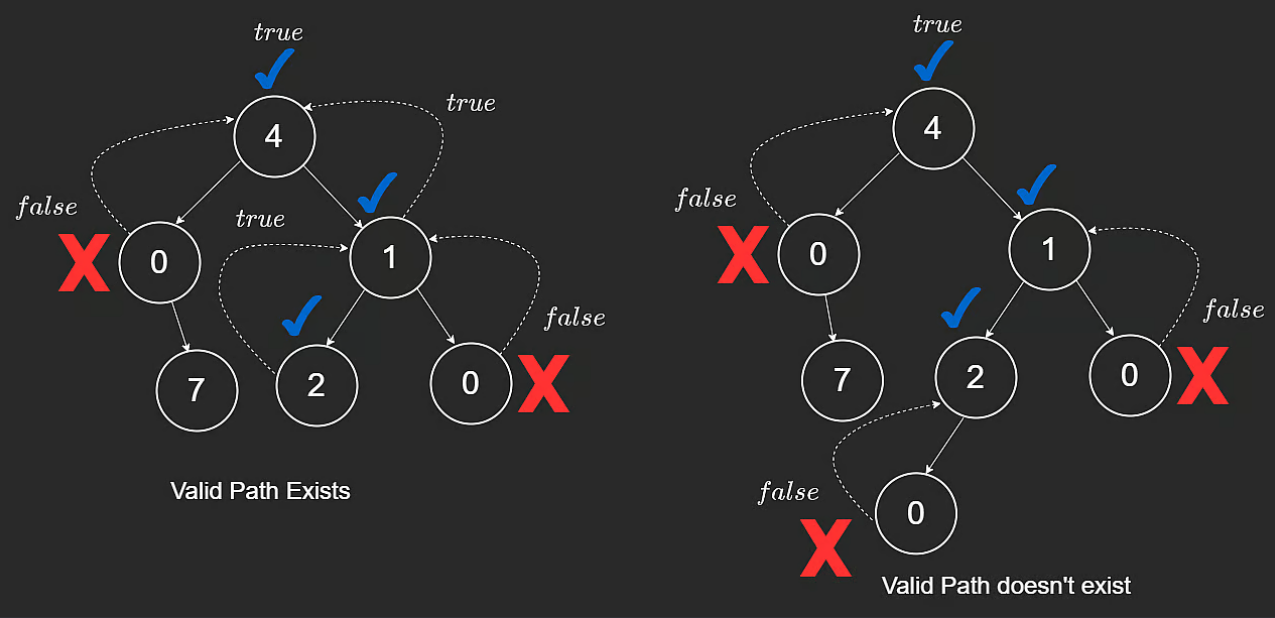 Q: Determine if a path exists from the root of the tree to a leaf node. It may not contain any zeroes.